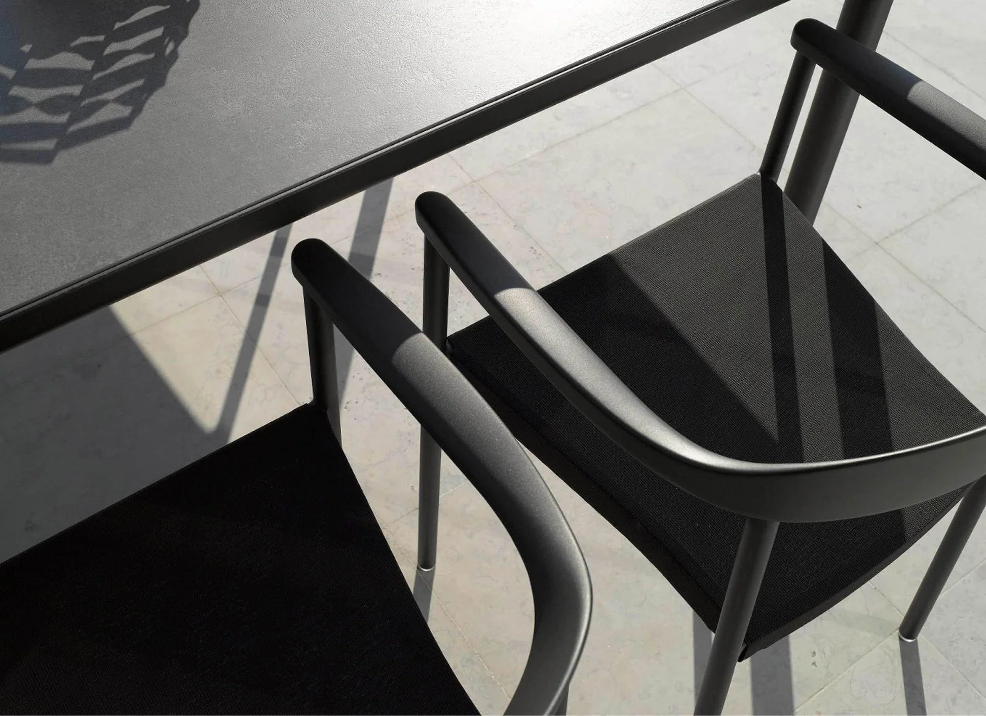 The Illum collection refers to classic Scandinavian furniture design, translated with outdoor materials. Aluminium is used like sculpted wood throughout the collection. Functionality is paramount, without compromising on comfort.