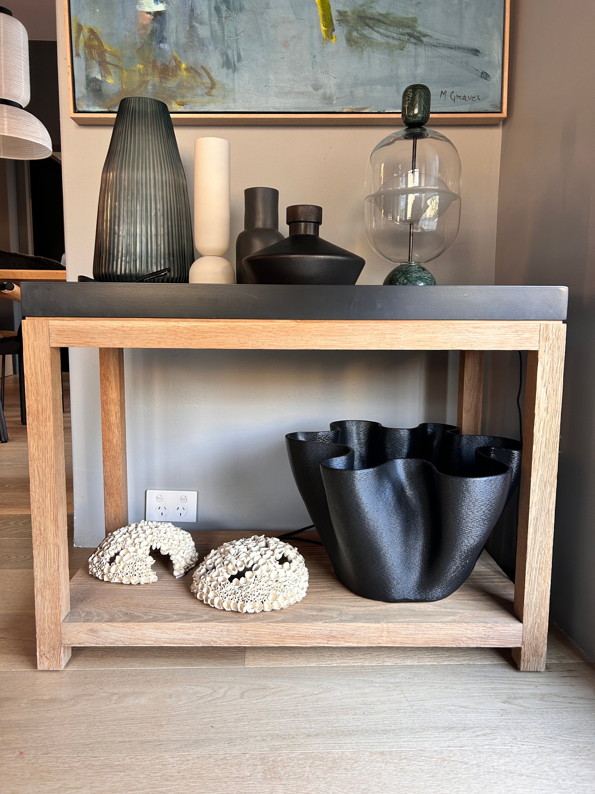 The Alex Tray Table - Small. The contrast of textures of the steel tray and timber frame, in different combinations, is the beauty of this versatile piece. It is designed to sit beside the sofa, but is equally at home as a sideboard console or bedside table.