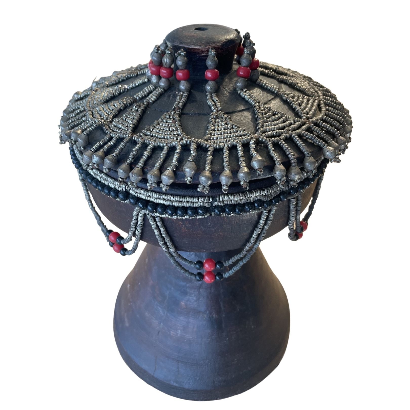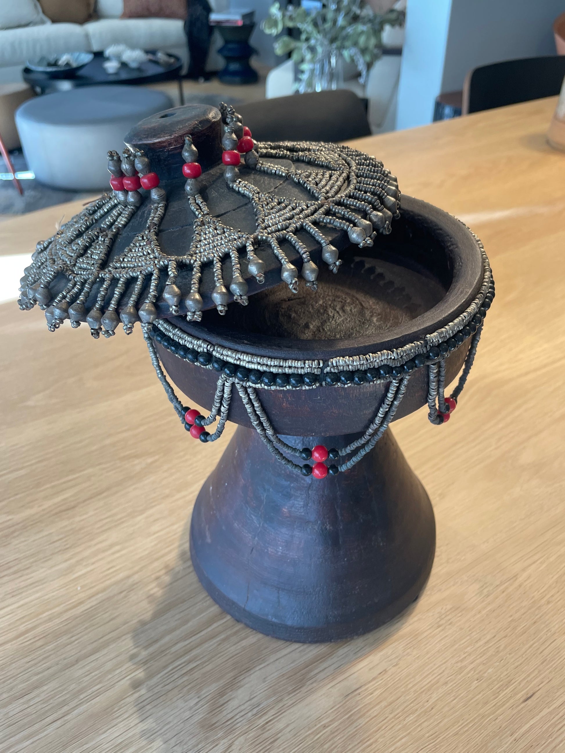 The Beaded Ethiopian Container is traditionally used to store food, and is equally useful to store jewellery or other precious wares. This wooden container is exquisitely decorated with Ethiopian metal heishi beads crafted by the Oromo people in the villages of Southern Ethiopia. A stunning and unique piece to create interest in your home.