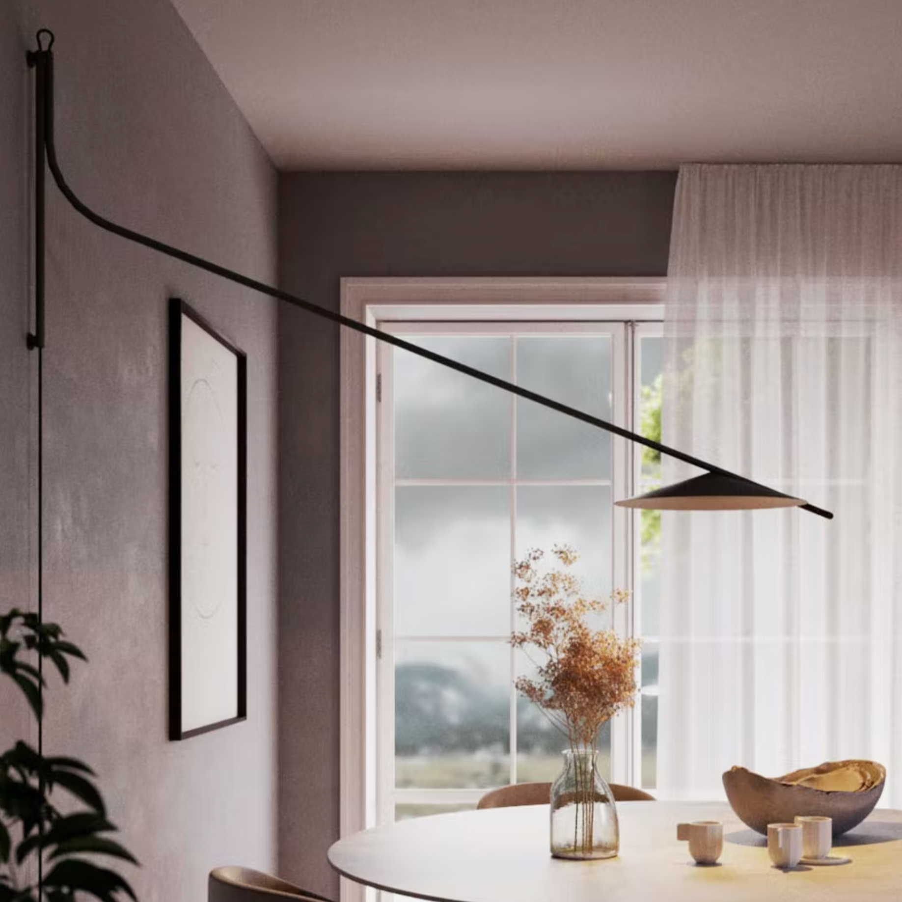 Inspired by fishing fixing systems and formed by a simple and essential structure. Two thin metal lines, in fact, make up the body of the model that ends in a delicate conical diffuser. Featuring an integrated LED lamp.