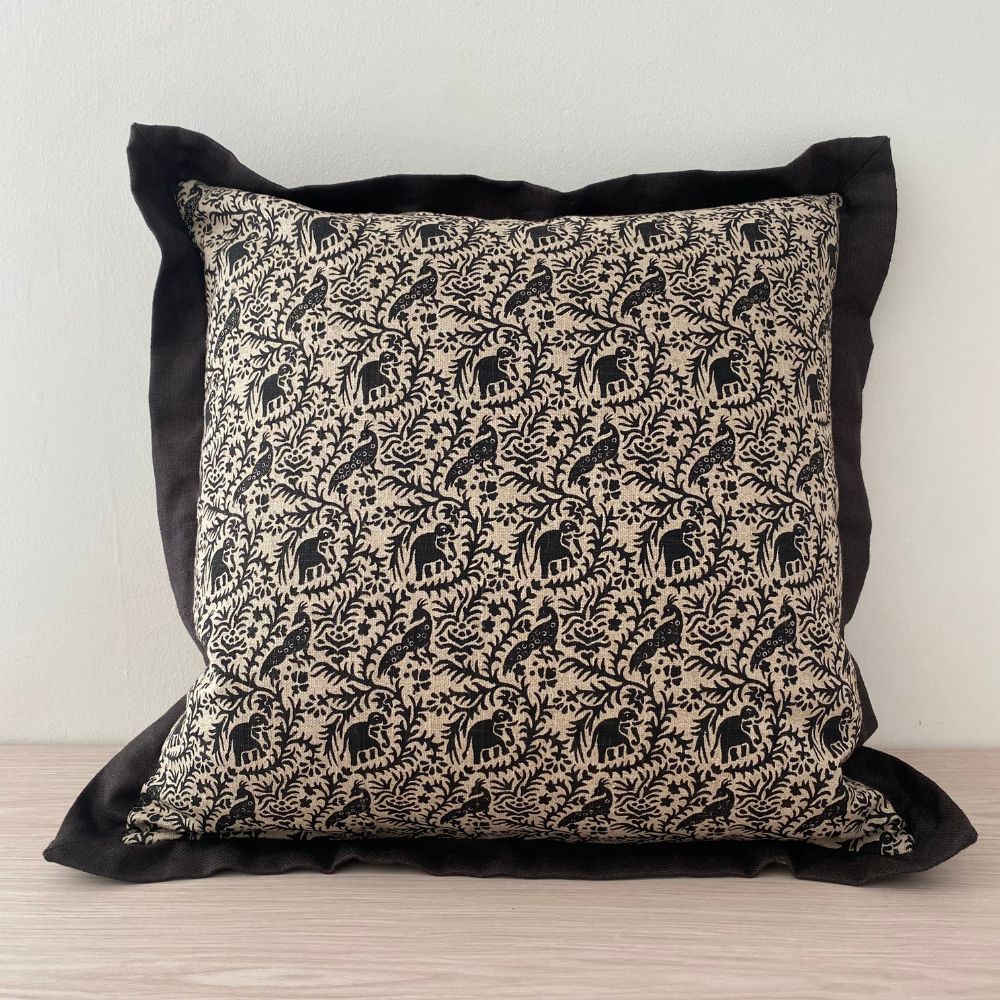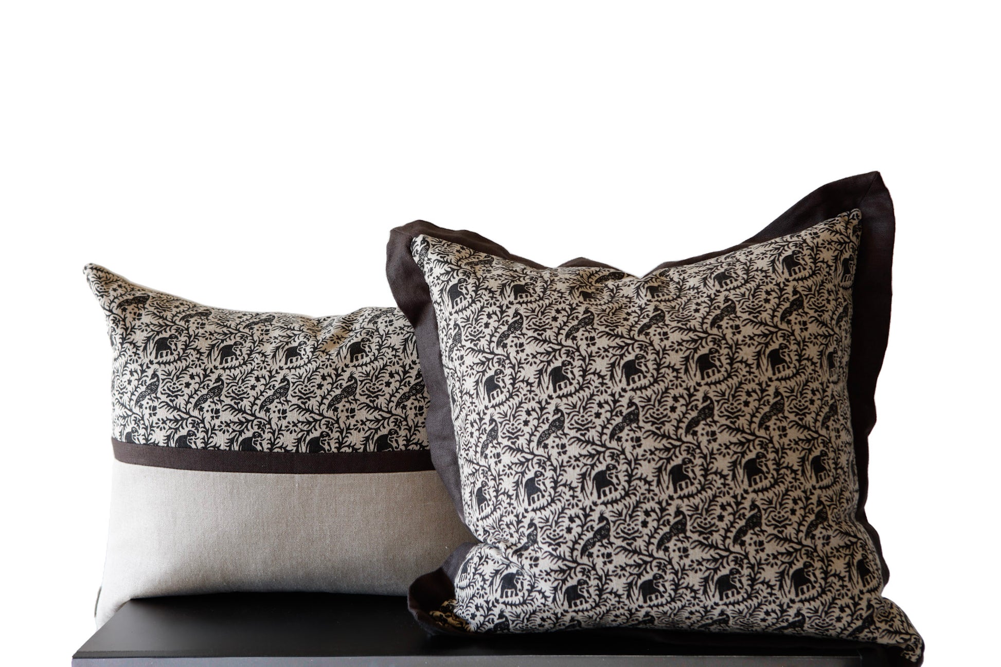 Asha features a striking patterned linen boarded with a contrasting flange. Pairs perfectly with our Pavi cushion