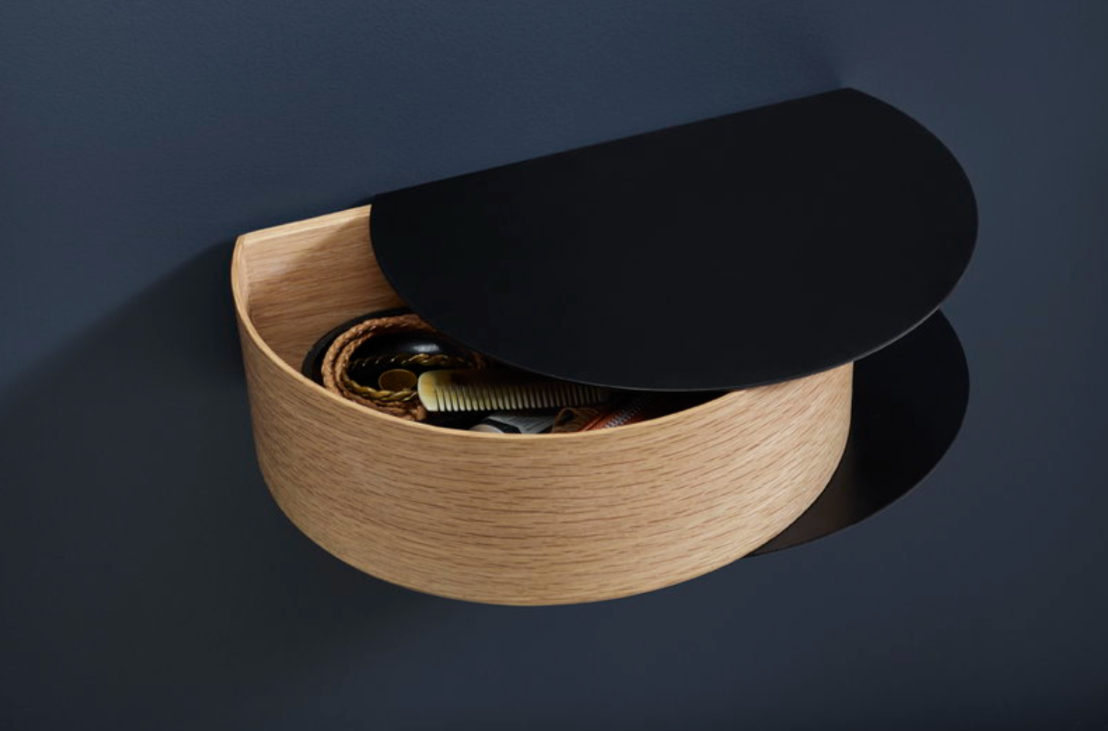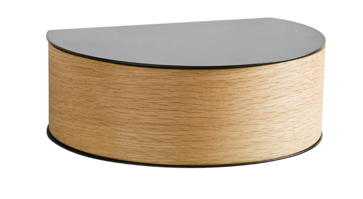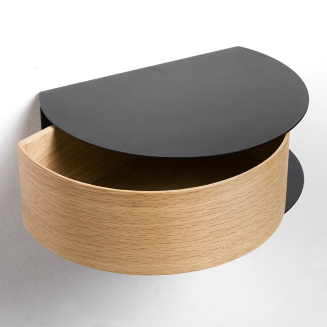 A perfect side table/wall mounted shelf with drawer for those smaller spaces. Wallie Shelf is circular shaped with a black metal bracket that embraces the magnetic wood drawer.