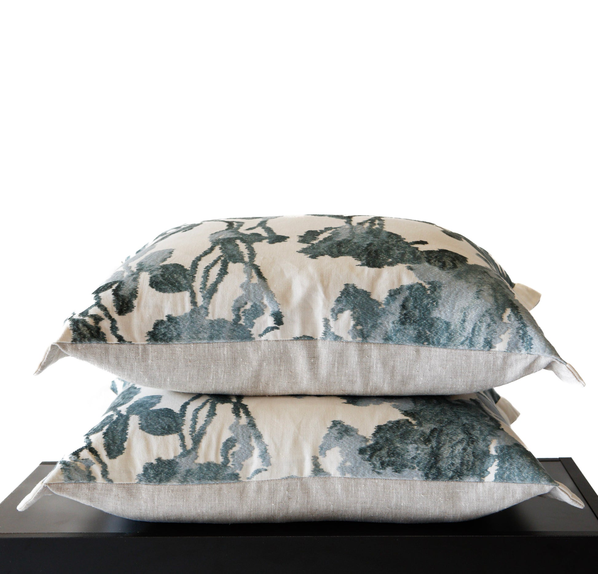 Hand embroidered fabric with hues of soft blues with a flange detail on the sides. Perfect size to pair up on a bed, side chair or on sofa.
