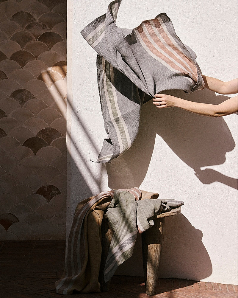 Luxurious, Italian-spun linen towels that dry quickly and can be used for bathing or the beach. Made at the Mungo Mill in Plettenberg Bay, South Africa.
