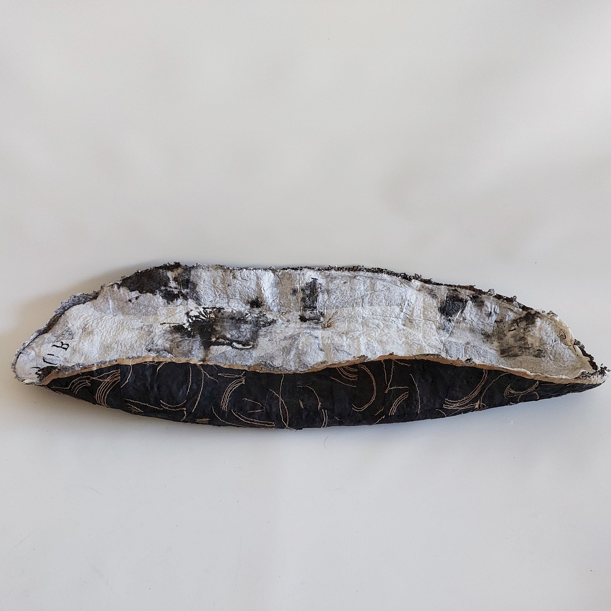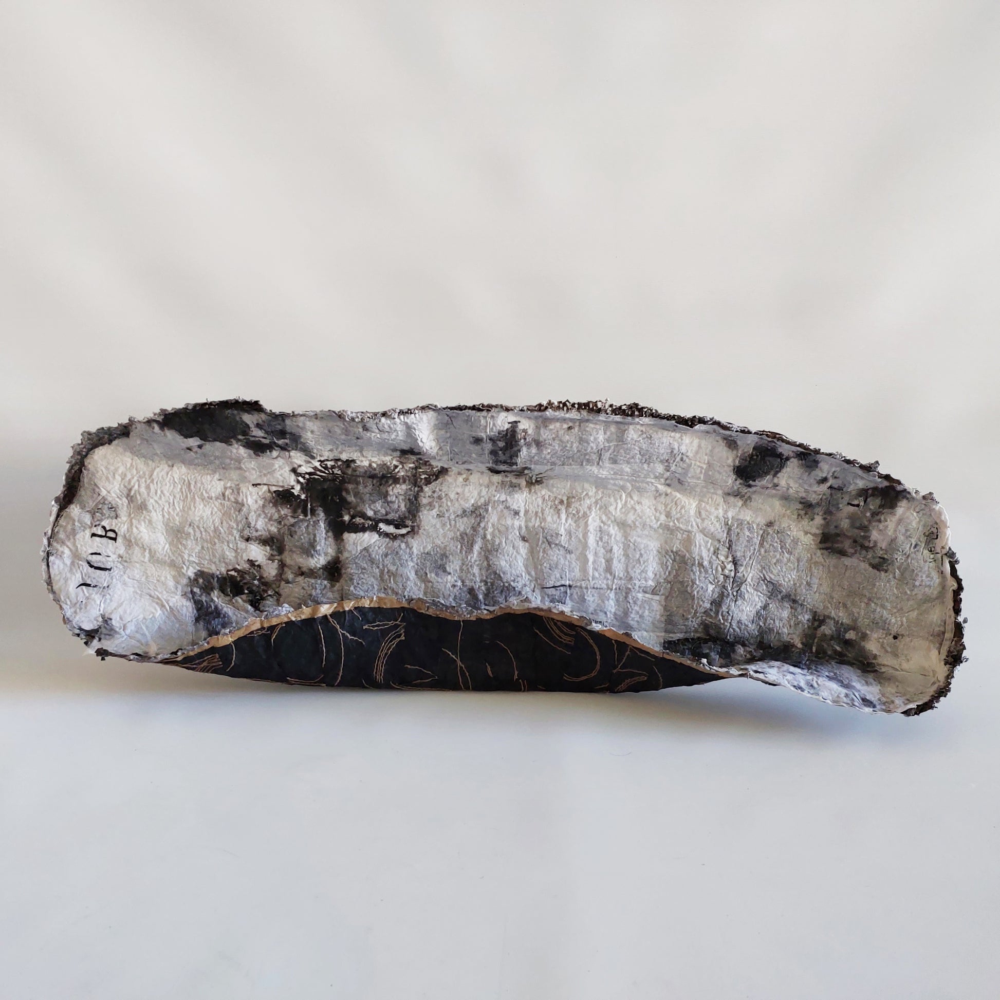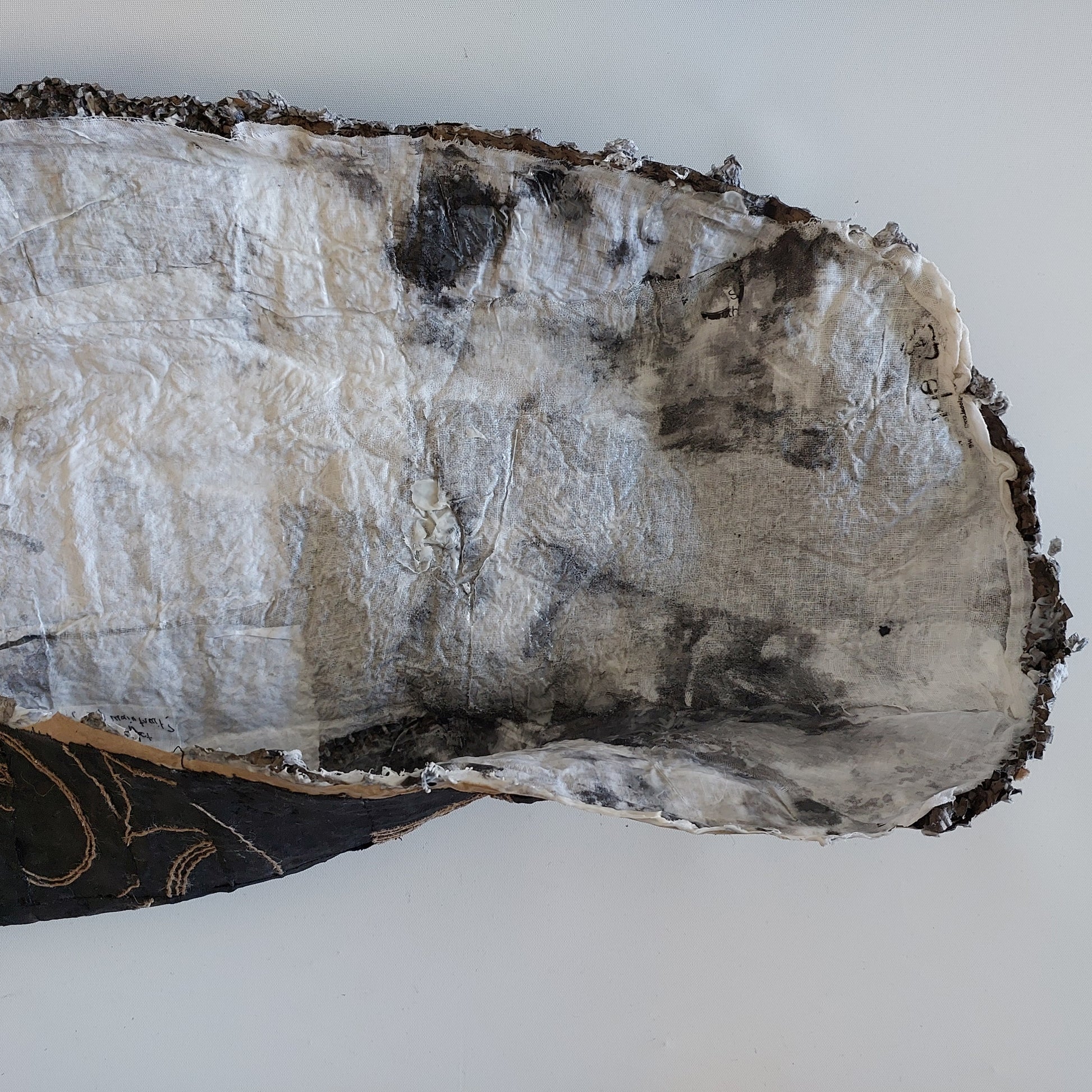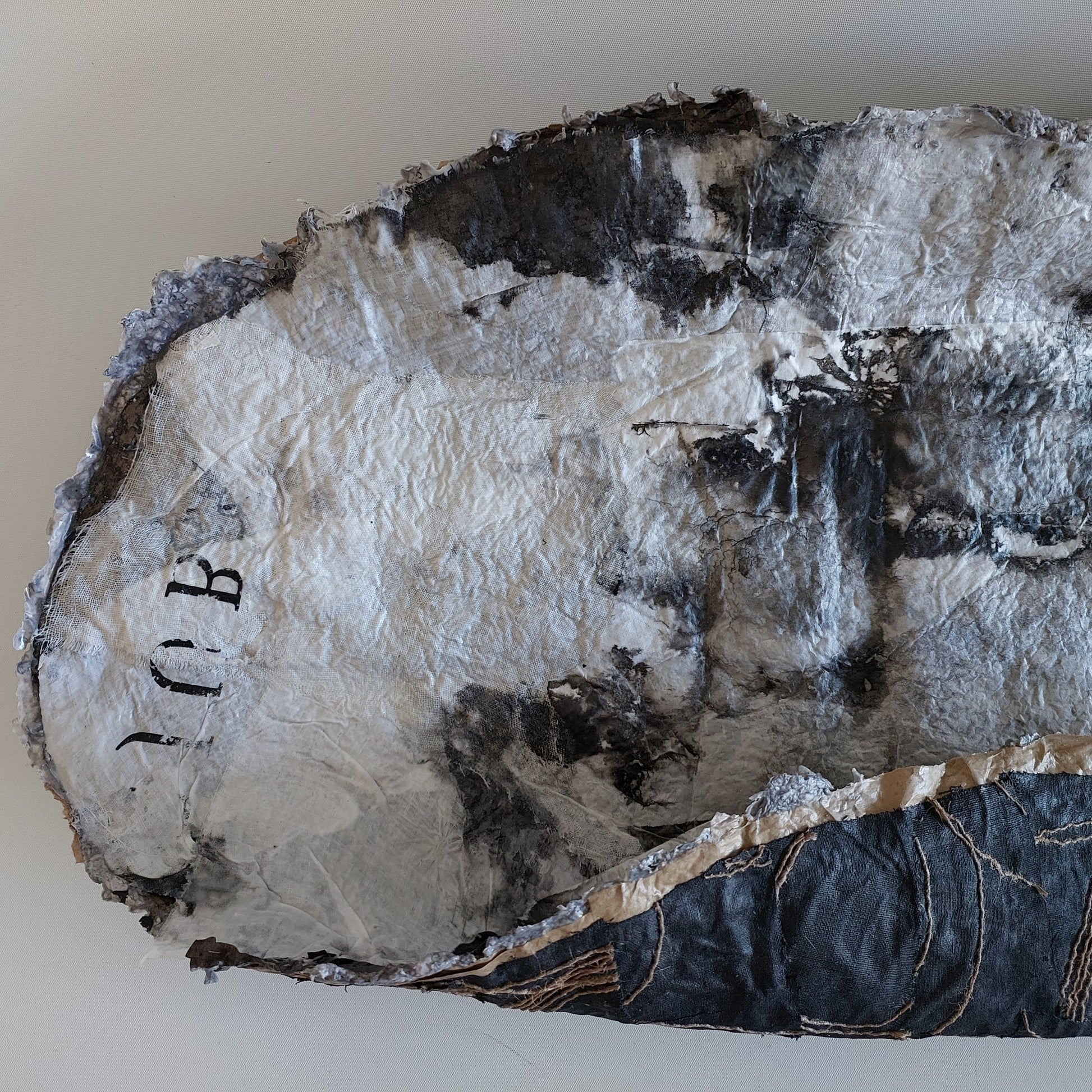 "Emergence, long platter" is created with paper, string, felt, denim, cotton and measures 1060mmL x 350mmW x 150mm
