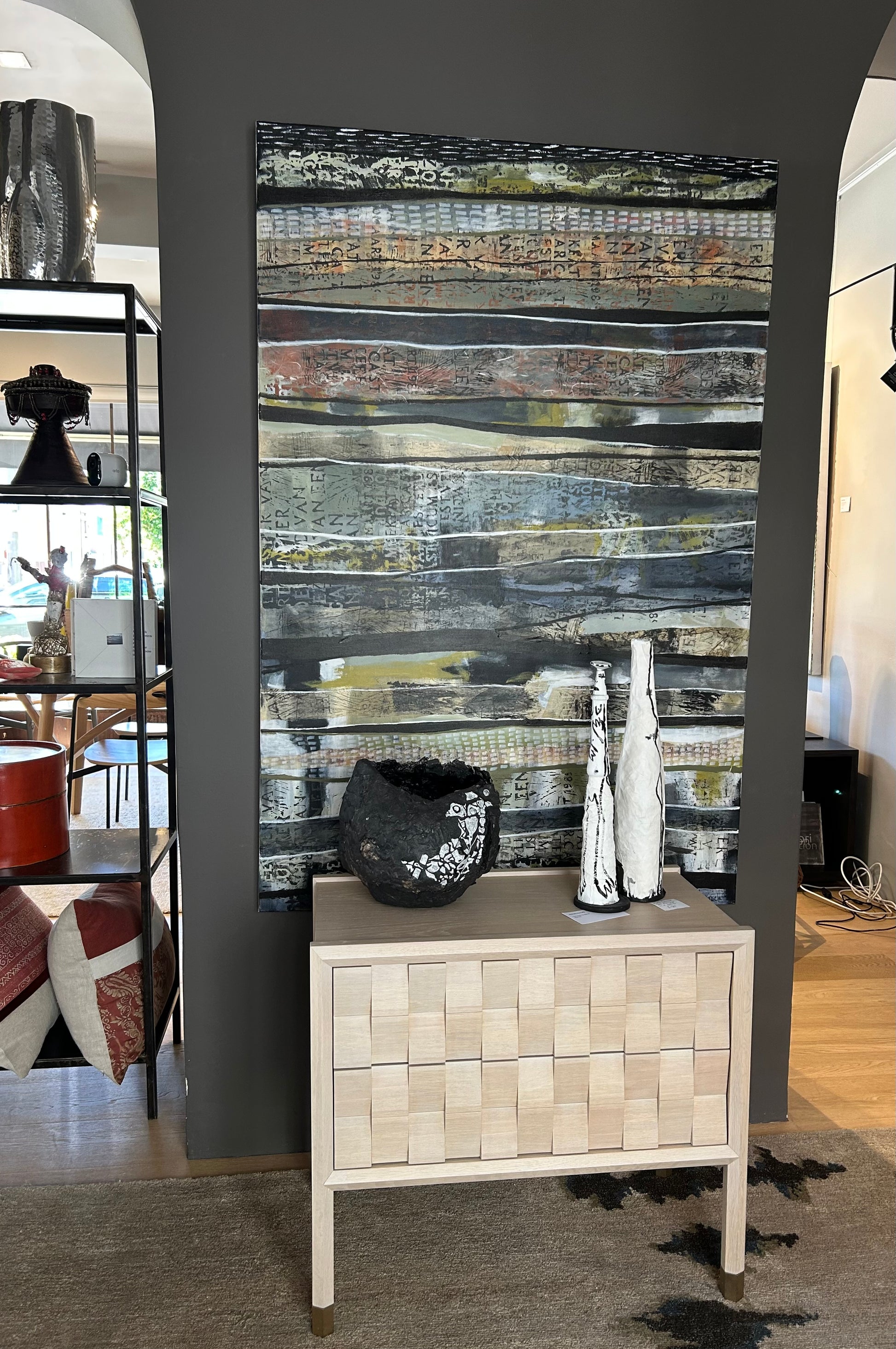 'Settling' is acrylic and collage on canvas and measures 152 x 102cm