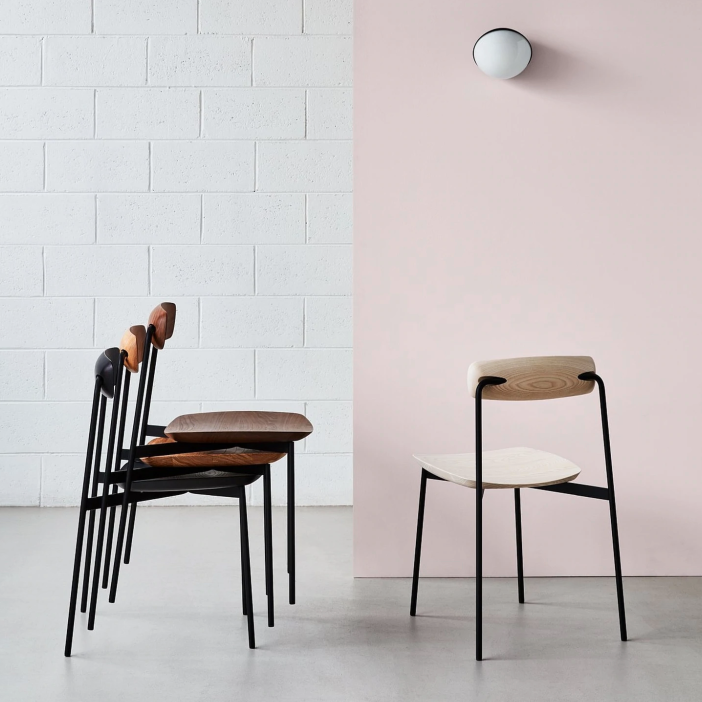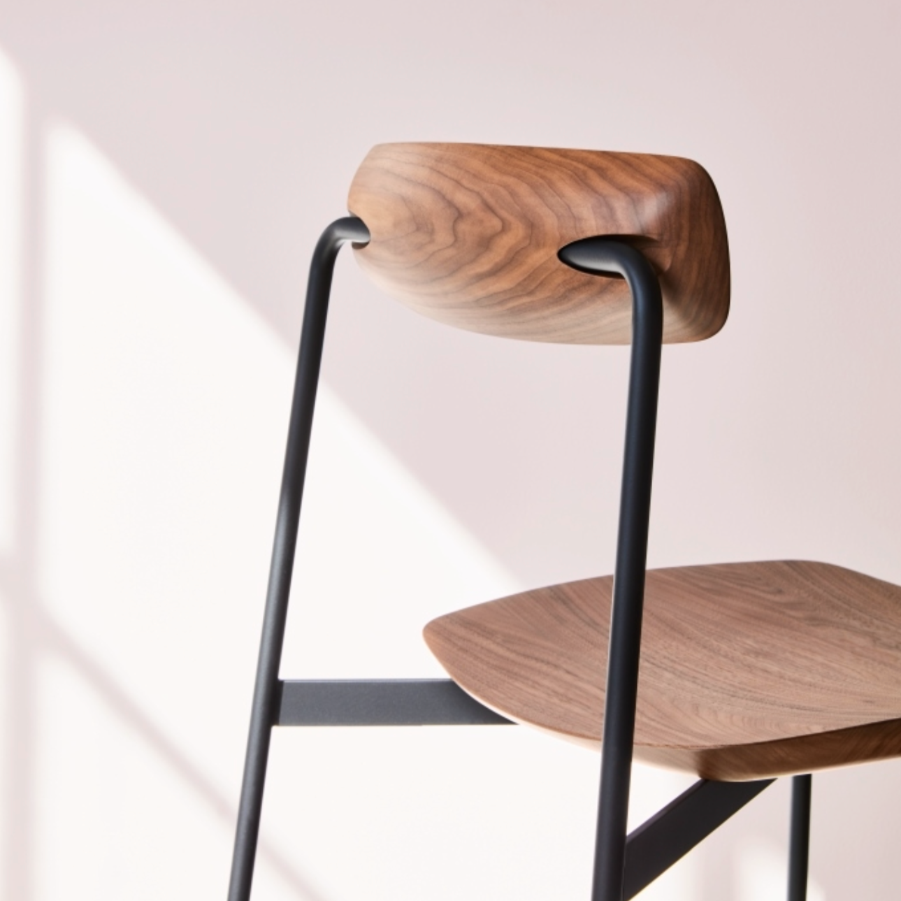 Shaped from solid natural Walnut, or Ash the curved seat and articulated back is contrasted by a minimal black steel frame that supports the sculptural timber elements and allows for a convenient stackable design.